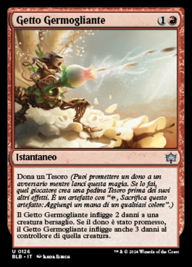 | Rules | Gift a Treasure (You may promise an opponent a gift as you cast this spell. If you do, they create a Treasure token before its other effects. It's an artifact with ", Sacrifice this artifact: Add one mana of any color.") Blooming Blast deals 2 damage to target creature. If the gift was promised, Blooming Blast also deals 3 damage to that creature's controller. |