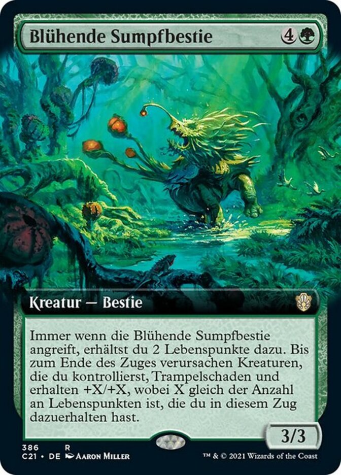 | Rules | Whenever Blossoming Bogbeast attacks, you gain 2 life. Then creatures you control gain trample and get +X/+X until end of turn, where X is the amount of life you gained this turn. |