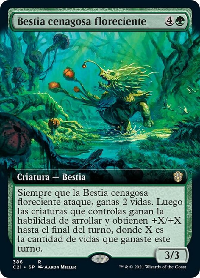 | Rules | Whenever Blossoming Bogbeast attacks, you gain 2 life. Then creatures you control gain trample and get +X/+X until end of turn, where X is the amount of life you gained this turn. |
