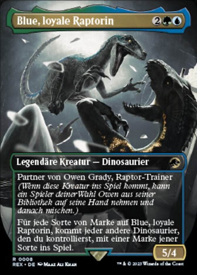 | Rules | Partner with Owen Grady, Raptor Trainer (When this creature enters the battlefield, target player may put Owen into their hand from their library, then shuffle.) For each kind of counter on Blue, Loyal Raptor, each other Dinosaur you control enters the battlefield with a counter of that kind on it. |
