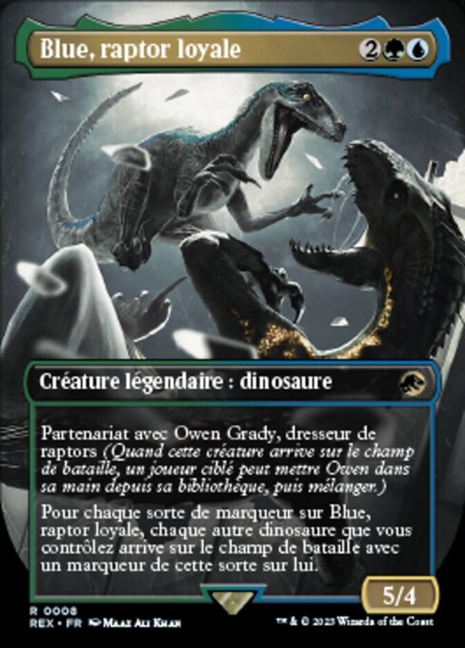| Rules | Partner with Owen Grady, Raptor Trainer (When this creature enters the battlefield, target player may put Owen into their hand from their library, then shuffle.) For each kind of counter on Blue, Loyal Raptor, each other Dinosaur you control enters the battlefield with a counter of that kind on it. |