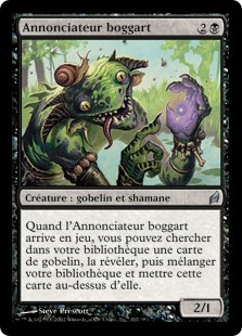 | Rules | When Boggart Harbinger enters the battlefield, you may search your library for a Goblin card, reveal it, then shuffle and put that card on top. |