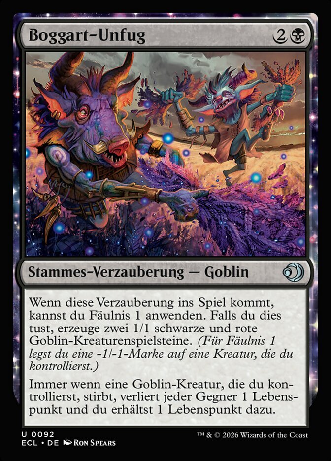 | Rules | When this enchantment enters, you may blight 1. If you do, create two 1/1 black and red Goblin creature tokens. (To blight 1, put a -1/-1 counter on a creature you control.) Whenever a Goblin creature you control dies, each opponent loses 1 life and you gain 1 life. |
