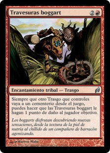 | Rules | Whenever another Goblin you control is put into a graveyard from the battlefield, you may have Boggart Shenanigans deal 1 damage to target player or planeswalker. |