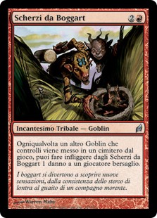 | Rules | Whenever another Goblin you control is put into a graveyard from the battlefield, you may have Boggart Shenanigans deal 1 damage to target player or planeswalker. |