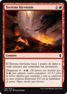 | Rules | Boiling Earth deals 1 damage to each creature your opponents control. Awaken 4— (If you cast this spell for , also put four +1/+1 counters on target land you control and it becomes a 0/0 Elemental creature with haste. It's still a land.) |