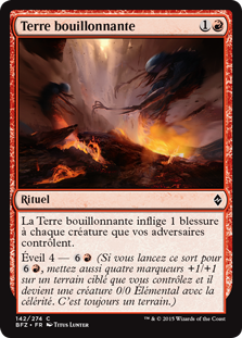| Rules | Boiling Earth deals 1 damage to each creature your opponents control. Awaken 4— (If you cast this spell for , also put four +1/+1 counters on target land you control and it becomes a 0/0 Elemental creature with haste. It's still a land.) |
