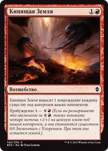 | Rules | Boiling Earth deals 1 damage to each creature your opponents control. Awaken 4— (If you cast this spell for , also put four +1/+1 counters on target land you control and it becomes a 0/0 Elemental creature with haste. It's still a land.) |