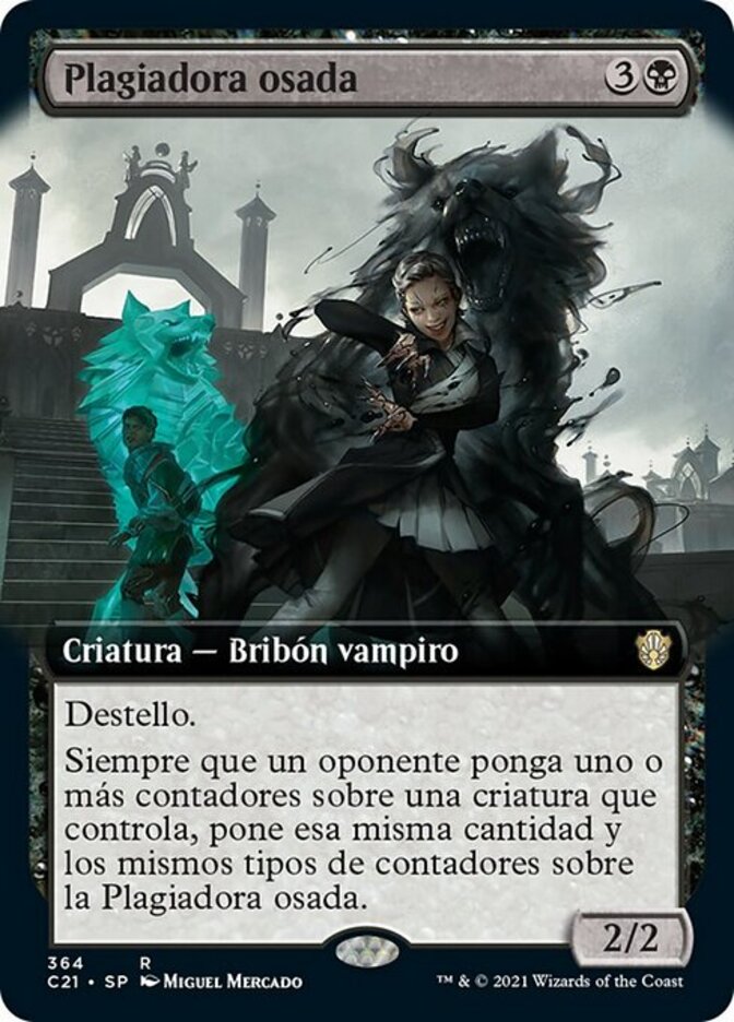 | Rules | Flash Whenever an opponent puts one or more counters on a creature they control, they put the same number and kind of counters on Bold Plagiarist. |