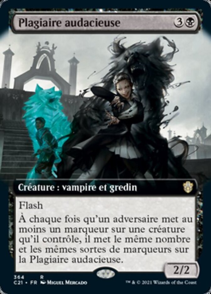 | Rules | Flash Whenever an opponent puts one or more counters on a creature they control, they put the same number and kind of counters on Bold Plagiarist. |