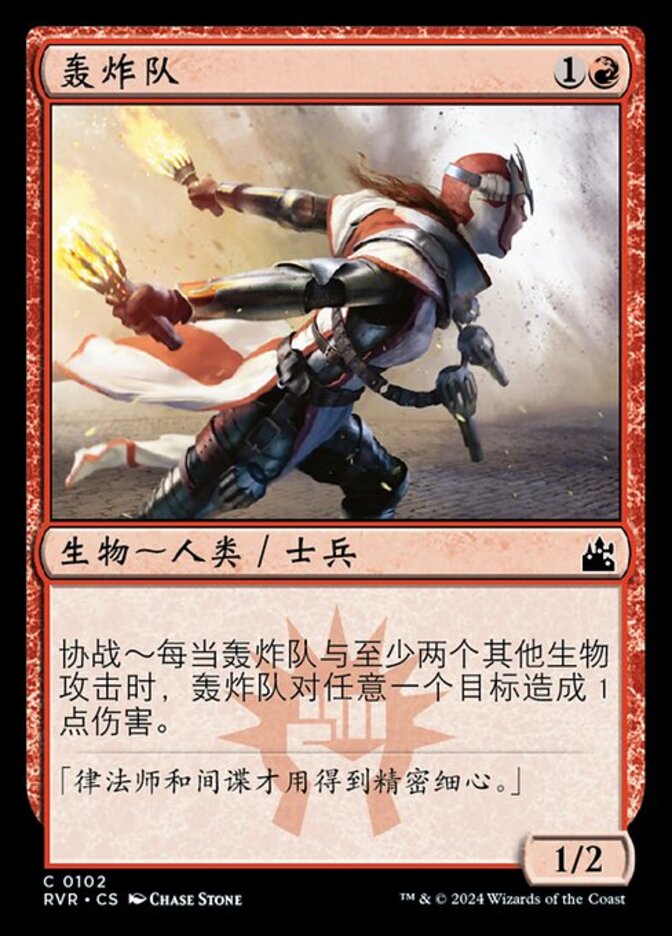 | Rules | Battalion — Whenever Bomber Corps and at least two other creatures attack, Bomber Corps deals 1 damage to any target. |