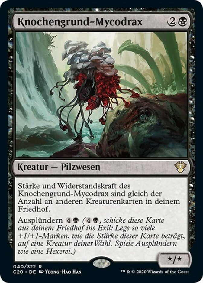 | Rules | Boneyard Mycodrax's power and toughness are each equal to the number of other creature cards in your graveyard. Scavenge (, Exile this card from your graveyard: Put a number of +1/+1 counters equal to this card's power on target creature. Scavenge only as a sorcery.) |
