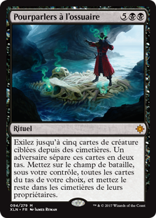 | Rules | Exile up to five target creature cards from graveyards. An opponent separates those cards into two piles. Put all cards from the pile of your choice onto the battlefield under your control and the rest into their owners' graveyards. |
