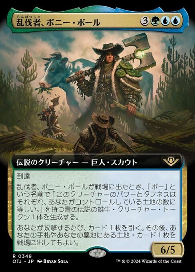 | Rules | Reach When Bonny Pall, Clearcutter enters the battlefield, create Beau, a legendary blue Ox creature token with "This creature's power and toughness are each equal to the number of lands you control." Whenever you attack, draw a card, then you may put a land card from your hand or graveyard onto the battlefield. |