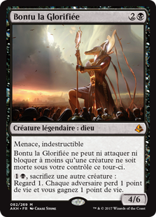 | Rules | Menace, indestructible Bontu the Glorified can't attack or block unless a creature died under your control this turn. , Sacrifice another creature: Scry 1. Each opponent loses 1 life and you gain 1 life. |