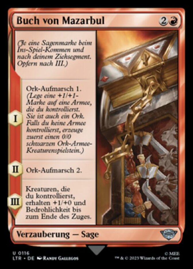 | Rules | (As this Saga enters and after your draw step, add a lore counter. Sacrifice after III.) I — Amass Orcs 1. (Put a +1/+1 counter on an Army you control. It's also an Orc. If you don't control an Army, create a 0/0 black Orc Army creature token first.) II — Amass Orcs 2. III — Creatures you control get +1/+0 and gain menace until end of turn. |