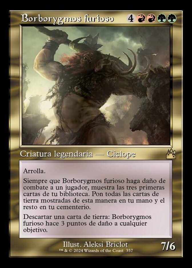 | Rules | Trample Whenever Borborygmos Enraged deals combat damage to a player, reveal the top three cards of your library. Put all land cards revealed this way into your hand and the rest into your graveyard. Discard a land card: Borborygmos Enraged deals 3 damage to any target. |