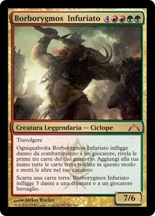 | Rules | Trample Whenever Borborygmos Enraged deals combat damage to a player, reveal the top three cards of your library. Put all land cards revealed this way into your hand and the rest into your graveyard. Discard a land card: Borborygmos Enraged deals 3 damage to any target. |
