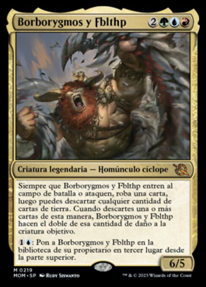 | Rules | Whenever Borborygmos and Fblthp enters the battlefield or attacks, draw a card, then you may discard any number of land cards. When you discard one or more cards this way, Borborygmos and Fblthp deals twice that much damage to target creature. : Put Borborygmos and Fblthp into its owner's library third from the top. |