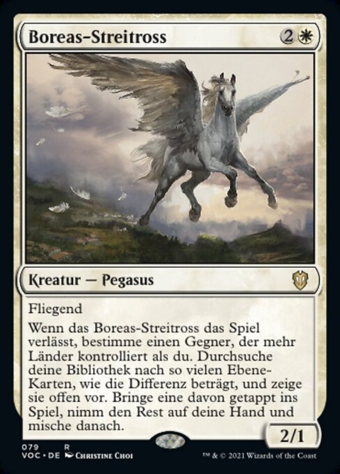 | Rules | Flying When Boreas Charger leaves the battlefield, choose an opponent who controls more lands than you. Search your library for a number of Plains cards equal to the difference, reveal those cards, put one of them onto the battlefield tapped and the rest into your hand, then shuffle. |