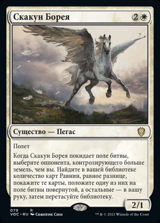 | Rules | Flying When Boreas Charger leaves the battlefield, choose an opponent who controls more lands than you. Search your library for a number of Plains cards equal to the difference, reveal those cards, put one of them onto the battlefield tapped and the rest into your hand, then shuffle. |