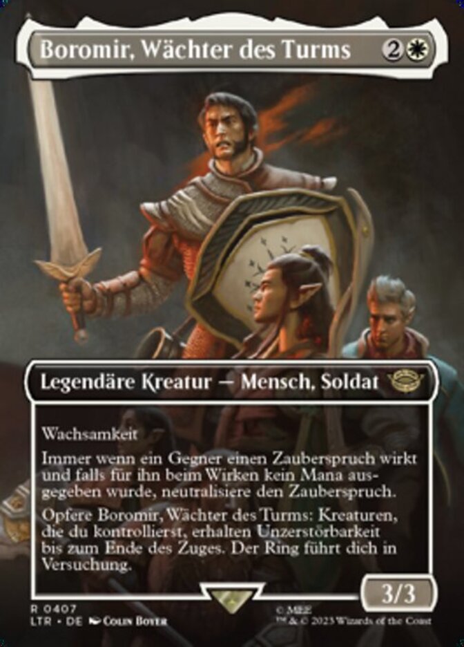 | Rules | Vigilance Whenever an opponent casts a spell, if no mana was spent to cast it, counter that spell. Sacrifice Boromir, Warden of the Tower: Creatures you control gain indestructible until end of turn. The Ring tempts you. |