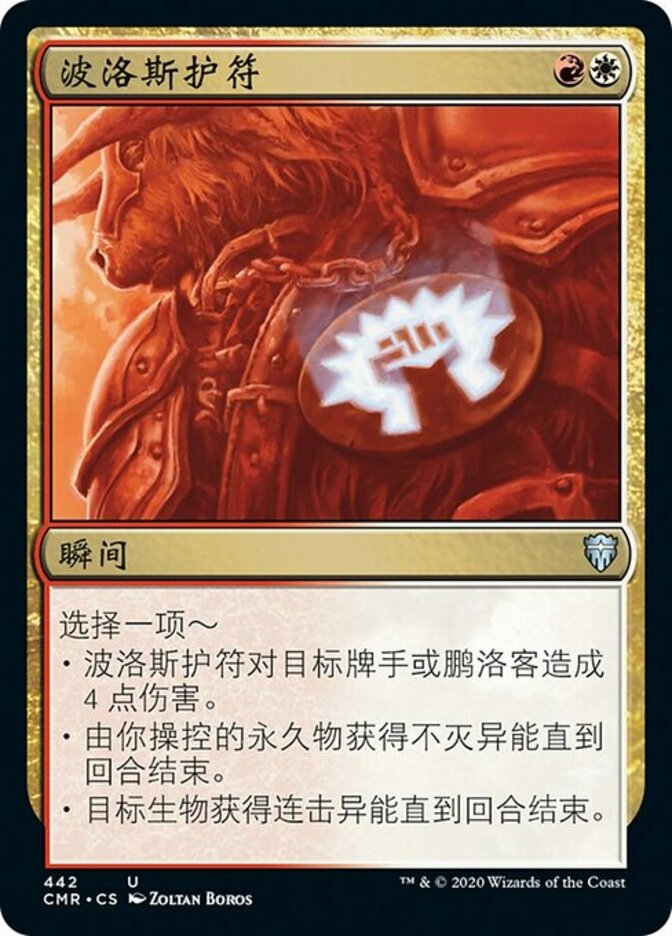 | Rules | Choose one — • Boros Charm deals 4 damage to target player or planeswalker. • Permanents you control gain indestructible until end of turn. • Target creature gains double strike until end of turn. |
