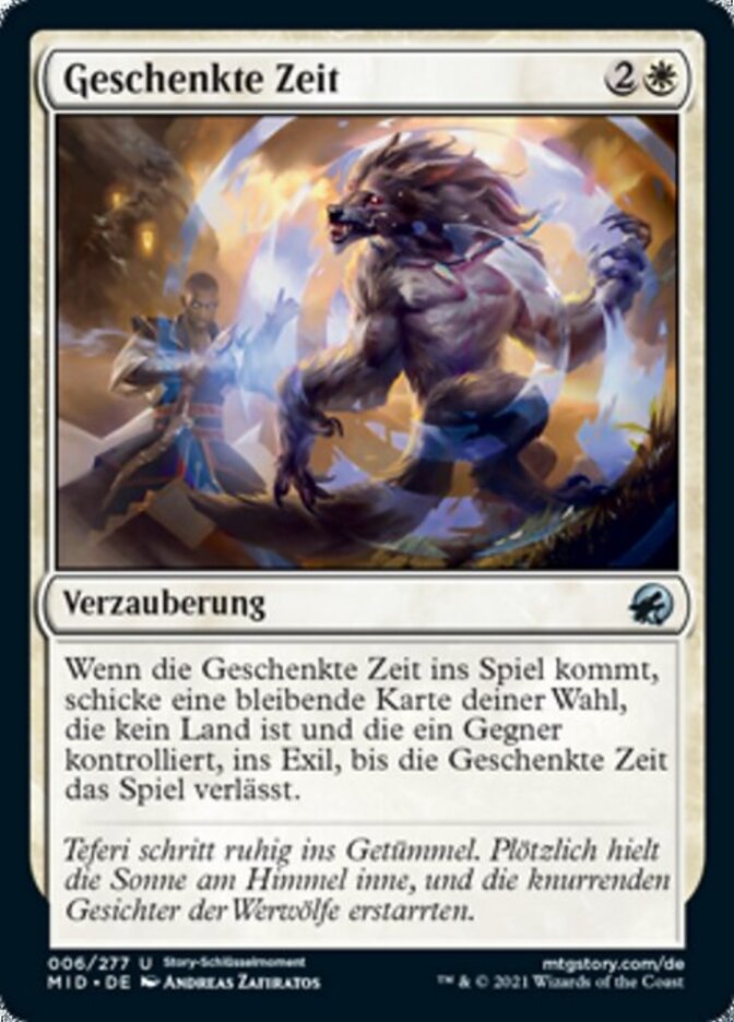 | Flavor | Teferi stepped calmly into the fray. Suddenly the sun paused in the sky and the werewolves' snarls froze on their faces. |
