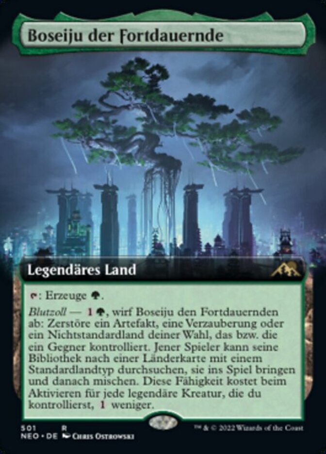 | Rules | : Add . Channel — , Discard Boseiju, Who Endures: Destroy target artifact, enchantment, or nonbasic land an opponent controls. That player may search their library for a land card with a basic land type, put it onto the battlefield, then shuffle. This ability costs less to activate for each legendary creature you control. |