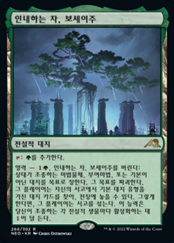 | Rules | : Add . Channel — , Discard Boseiju, Who Endures: Destroy target artifact, enchantment, or nonbasic land an opponent controls. That player may search their library for a land card with a basic land type, put it onto the battlefield, then shuffle. This ability costs less to activate for each legendary creature you control. |