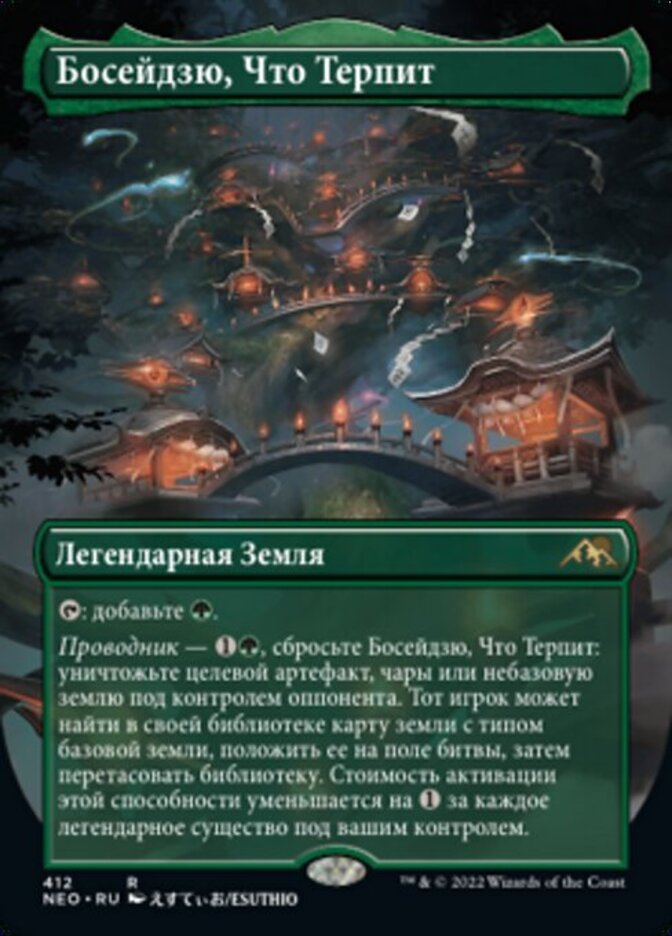 | Rules | : Add . Channel — , Discard Boseiju, Who Endures: Destroy target artifact, enchantment, or nonbasic land an opponent controls. That player may search their library for a land card with a basic land type, put it onto the battlefield, then shuffle. This ability costs less to activate for each legendary creature you control. |