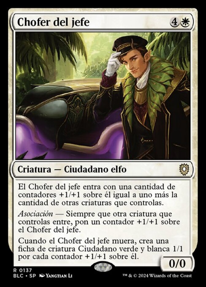 | Rules | Boss's Chauffeur enters the battlefield with a number of +1/+1 counters on it equal to one plus the number of other creatures you control. Alliance — Whenever another creature enters the battlefield under your control, put a +1/+1 counter on Boss's Chauffeur. When Boss's Chauffeur dies, create a 1/1 green and white Citizen creature token for each +1/+1 counter on it. |