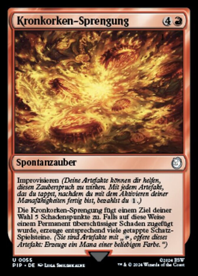 | Rules | Improvise (Your artifacts can help cast this spell. Each artifact you tap after you're done activating mana abilities pays for .) Bottle-Cap Blast deals 5 damage to any target. If excess damage was dealt to a permanent this way, create that many tapped Treasure tokens. (They're artifacts with ", Sacrifice this artifact: Add one mana of any color.") |