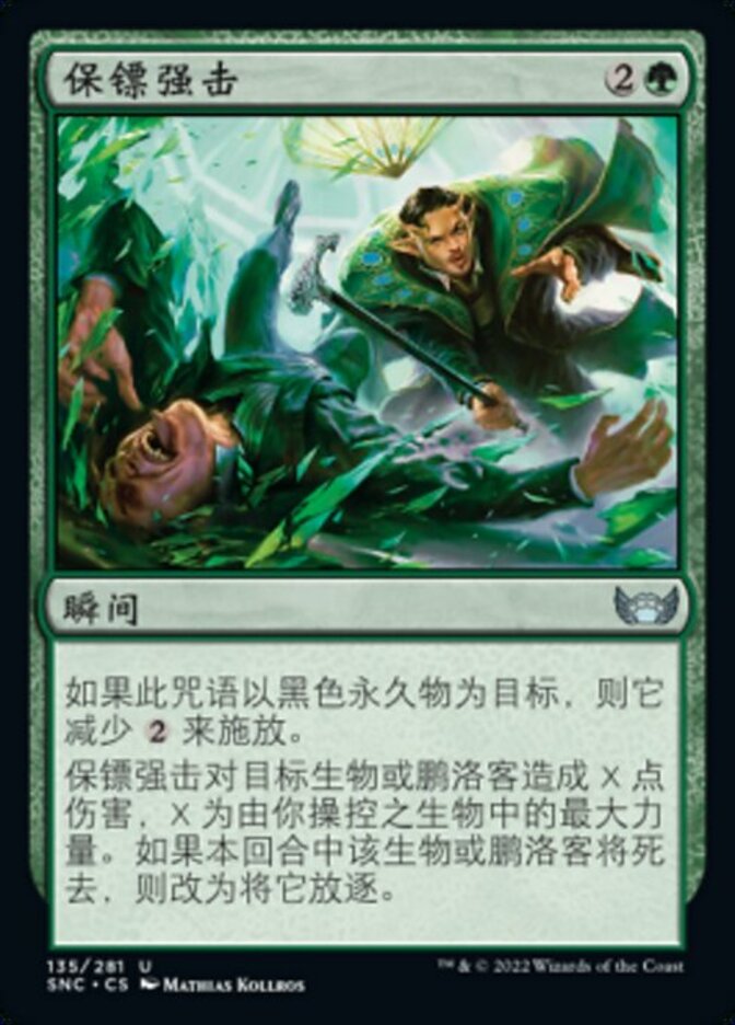 | Rules | This spell costs less to cast if it targets a black permanent. Bouncer's Beatdown deals X damage to target creature or planeswalker, where X is the greatest power among creatures you control. If that creature or planeswalker would die this turn, exile it instead. |