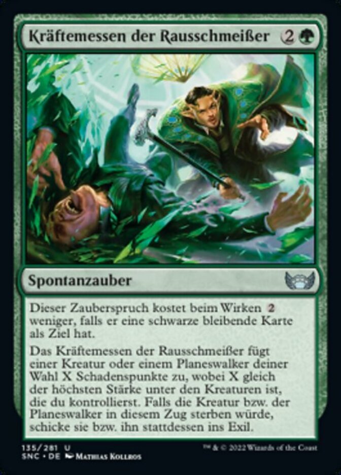 | Rules | This spell costs less to cast if it targets a black permanent. Bouncer's Beatdown deals X damage to target creature or planeswalker, where X is the greatest power among creatures you control. If that creature or planeswalker would die this turn, exile it instead. |