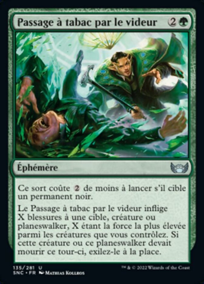 | Rules | This spell costs less to cast if it targets a black permanent. Bouncer's Beatdown deals X damage to target creature or planeswalker, where X is the greatest power among creatures you control. If that creature or planeswalker would die this turn, exile it instead. |