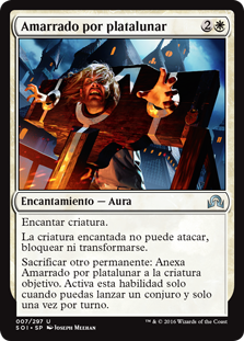 | Rules | Enchant creature Enchanted creature can't attack, block, or transform. Sacrifice another permanent: Attach Bound by Moonsilver to target creature. Activate only as a sorcery and only once each turn. |