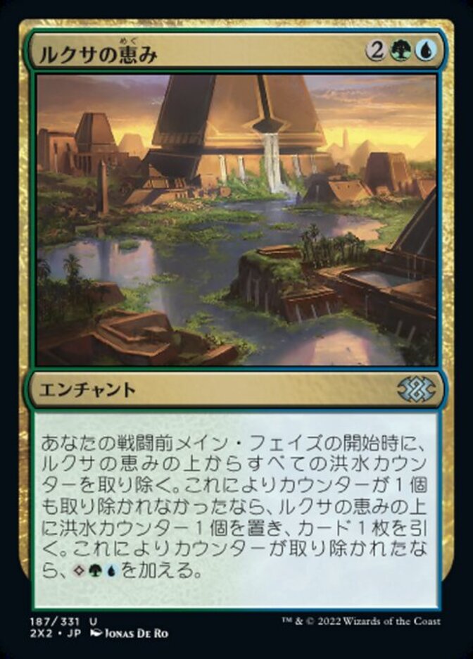 | Rules | At the beginning of your precombat main phase, remove all flood counters from Bounty of the Luxa. If no counters were removed this way, put a flood counter on Bounty of the Luxa and draw a card. Otherwise, add . |