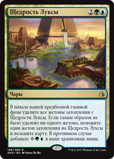 | Rules | At the beginning of your precombat main phase, remove all flood counters from Bounty of the Luxa. If no counters were removed this way, put a flood counter on Bounty of the Luxa and draw a card. Otherwise, add . |