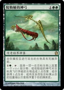 | Rules | Attacking creatures you control have deathtouch. , : Choose one — • Put a +1/+1 counter on target creature. • Bow of Nylea deals 2 damage to target creature with flying. • You gain 3 life. • Put up to four target cards from your graveyard on the bottom of your library in any order. |