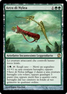 | Rules | Attacking creatures you control have deathtouch. , : Choose one — • Put a +1/+1 counter on target creature. • Bow of Nylea deals 2 damage to target creature with flying. • You gain 3 life. • Put up to four target cards from your graveyard on the bottom of your library in any order. |