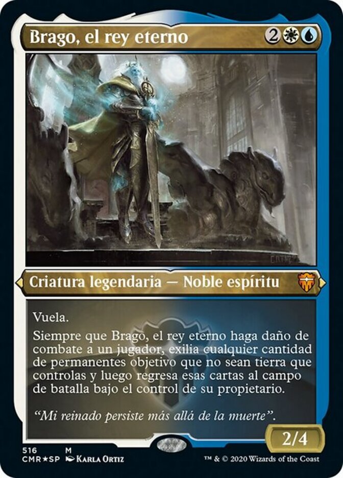 | Rules | Flying Whenever Brago, King Eternal deals combat damage to a player, exile any number of target nonland permanents you control, then return those cards to the battlefield under their owner's control. |