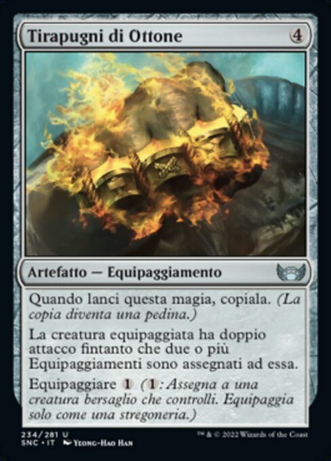 | Rules | When you cast this spell, copy it. (The copy becomes a token.) Equipped creature has double strike as long as two or more Equipment are attached to it. Equip (: Attach to target creature you control. Equip only as a sorcery.) |