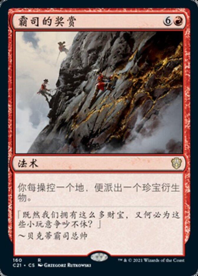 Rules For each land you control, create a Treasure token. (It's an artifact with ", Sacrifice this artifact: Add one mana of any color.")