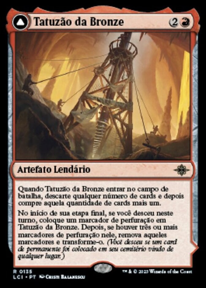 | Rules | When Brass's Tunnel-Grinder enters the battlefield, discard any number of cards, then draw that many cards plus one. At the beginning of your end step, if you descended this turn, put a bore counter on Brass's Tunnel-Grinder. Then if there are three or more bore counters on it, remove those counters and transform it. (You descended if a permanent card was put into your graveyard from anywhere.) // (Transforms from Brass's Tunnel-Grinder.) : Add . Whenever you cast a permanent spell using mana produced by Tecutlan, the Searing Rift, discover X, where X is that spell's mana value. |
