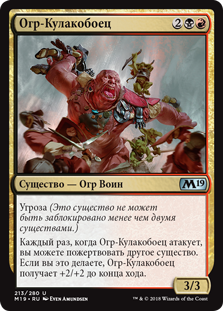 | Rules | Menace (This creature can't be blocked except by two or more creatures.) Whenever Brawl-Bash Ogre attacks, you may sacrifice another creature. If you do, Brawl-Bash Ogre gets +2/+2 until end of turn. |