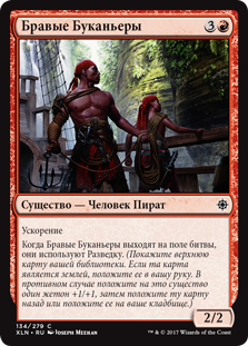 | Rules | Haste When Brazen Buccaneers enters the battlefield, it explores. (Reveal the top card of your library. Put that card into your hand if it's a land. Otherwise, put a +1/+1 counter on this creature, then put the card back or put it into your graveyard.) |