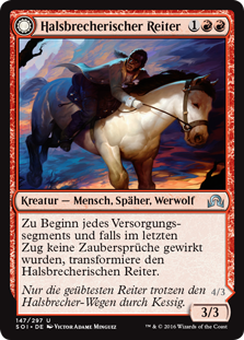 | Rules | At the beginning of each upkeep, if no spells were cast last turn, transform Breakneck Rider. // Attacking creatures you control get +1/+0 and have trample. At the beginning of each upkeep, if a player cast two or more spells last turn, transform Neck Breaker. |