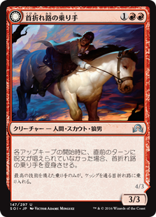 | Rules | At the beginning of each upkeep, if no spells were cast last turn, transform Breakneck Rider. // Attacking creatures you control get +1/+0 and have trample. At the beginning of each upkeep, if a player cast two or more spells last turn, transform Neck Breaker. |
