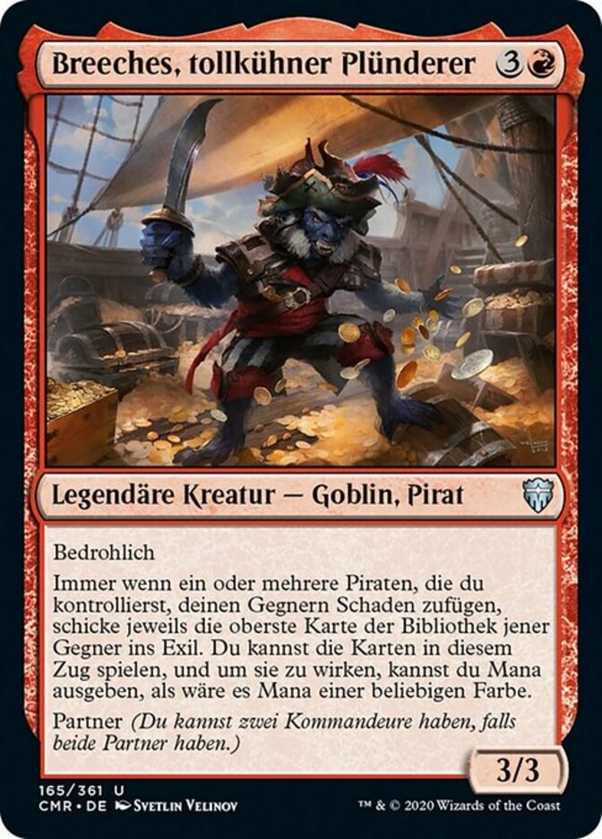 | Rules | Menace Whenever one or more Pirates you control deal damage to your opponents, exile the top card of each of those opponents' libraries. You may play those cards this turn, and you may spend mana as though it were mana of any color to cast those spells. Partner (You can have two commanders if both have partner.) |